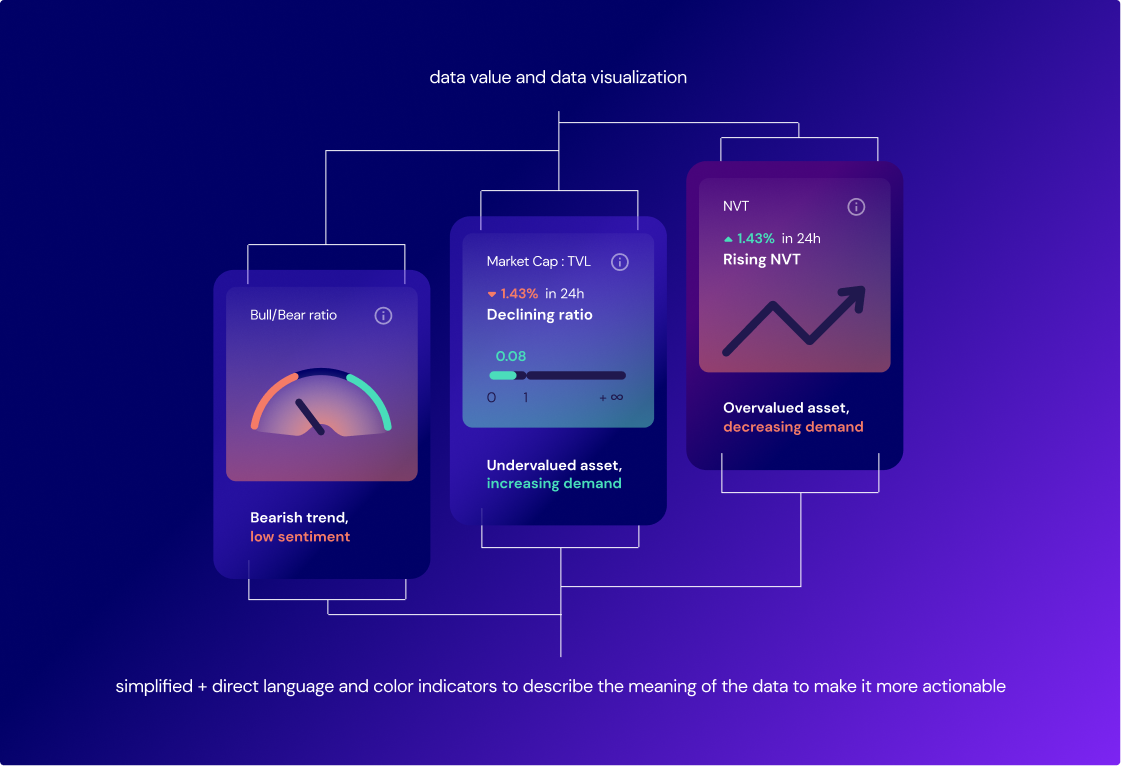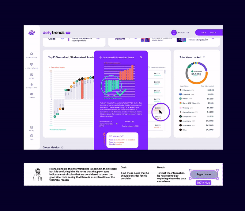 The dashboard provides AI and data-backed information on the crypto market to communicate it to the users in a more simplified way. The goal is to shorten the time spent searching for market insights by providing them for users who wish to make informed investment decisions. Product development for this dashboard included two phases. The first phase was the soft launch, where I orchestrated a series of usability tests using the Figma prototype. The users and investors could see the product's vision and test it for themselves. This soft launch has boosted investments for the company. My prototype of a fully functional version of the experience has shown the team any pain points that need work based on the user insights. For the second phase, I worked with the front-end team to create the BETA, taking into account all the learnings from the research phases. The BETA is now available, with more improvements to come once the market gets back on its feet.